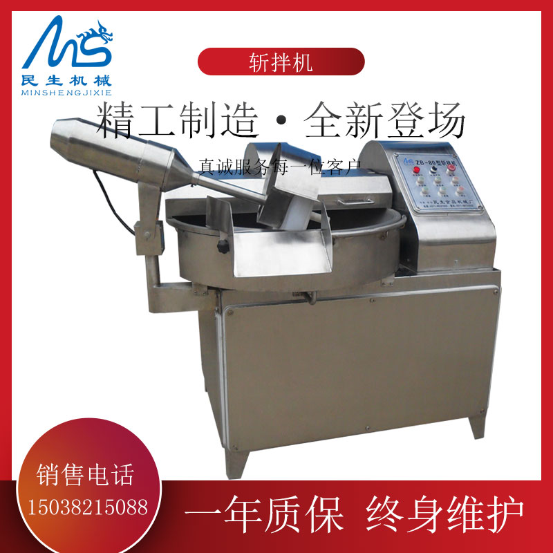 變頻斬拌機利用斬刀高速旋轉(zhuǎn)的斬切作用,將肉及輔料斬成肉餡或肉泥,還可以將輔料、冰片、水與肉餡或肉塊一起攪拌均勻。