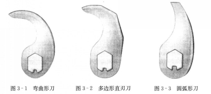 1、彎曲形刀 這類刀(圖3-1)的刃口呈彎曲形,斬切時刀呈拉扯型切割,特別適用于顆粒狀香腸肉餡的斬切。當配以不同的速度時,該刀同樣適用于低溫蒸煮香腸肉餡的斬切,如啤酒香腸的加工。該刀也適用于中式香腸的加工。
