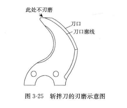 (2)開動機器,使刀與粗砂輪進行摩擦,同時給磨刀輥施加一定壓力,促進磨刀效果。要求在斬切刀刀尖處未開刃,此部分不需刃磨(圖3—25)。